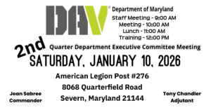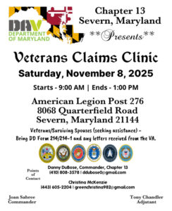 Commander Danny DuBose invites ALL Chapters and Unit Members to their Veterans Claims Clinic at Chapter 13 in Severn, MD, on Saturday, November 8th starting at 9:00 AM and ending at 1:00 PM. Please download this flyer and spread the word.