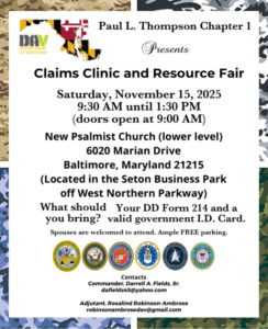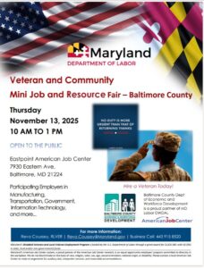 On Thursday, November 13, 2025, from 10:00 AM until 1:00 PM, the Maryland Department of Labor will present a Veteran and Community Mini Job and Resource Fair at the Eastpoint American Job Center, 7930 Eastern Ave., Baltimore, Maryland 21224. This event is OPEN TO THE PUBLIC. Check out the flyer for additional details.