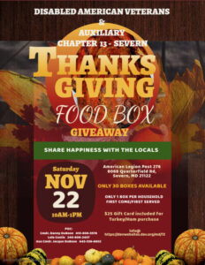 On Saturday, November 22, 2025, DAV Auxiliary Unit 13 members will host a FoodBox Giveaway. There will be a limited amount of food boxes available, approximately 30. So, be early and on time to pick up one of these food boxes.